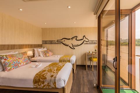 M/V Manatee Amazon Explorer Cruise lets you experience it all aboard a luxury river cruise. Stay in one of 10 Standard Cabins equipped with air conditioning, a private hot water en-suite, floor to ceiling windows, and a balcony from which to enjoy it all. Or, upgrade to one of 4 Deluxe Cabins; they feature all of the comforts of Standard Cabins, plus the added indulgence of a private balcony, whirlpool bathtub, and view.