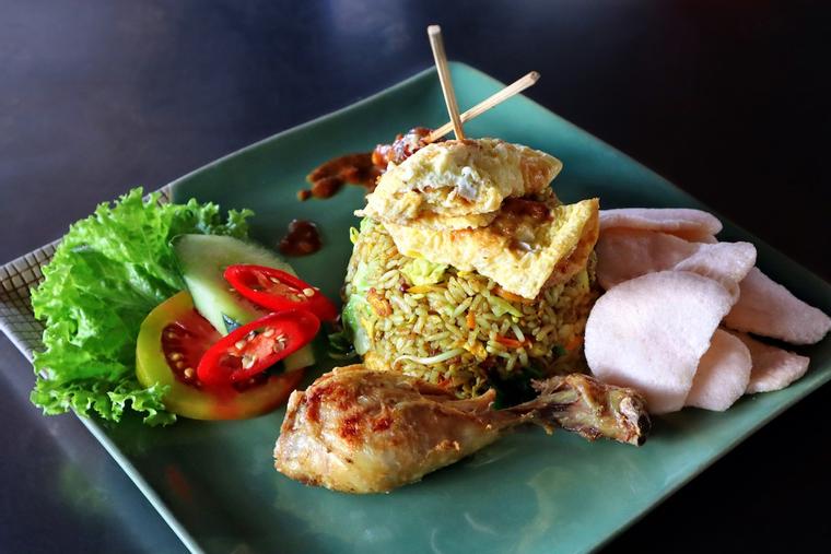 Most meals feature rice with sides of meat and vegetables, although there are also many noodle dishes. The national dish is tumpeng, a cone-shaped pile of rice in the center of a plate surrounded by sides and meat. Other famous Indonesian dishes include rendang (a slow-cooked meat dish) and nasi goreng (fried rice). Vegetarian options are easily found in local cuisine, as tempeh and tofu are common choices instead of meat. Shrimp paste may be used as a spice or cooking ingredients, so be sure to ask if this is a dietary issue.